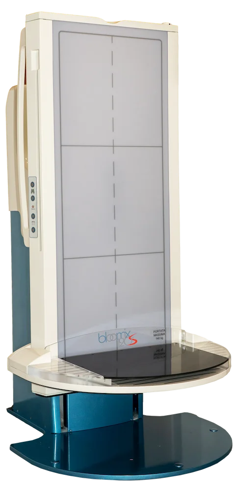l’area attiva di 120 x 43 cm di Bloomix, consente l’acquisizione di esami sotto carico di lungo formato in un unico scatto, senza necessità di ricorrere a più esposizioni, velocizzando il flusso di lavoro nella diagnostica